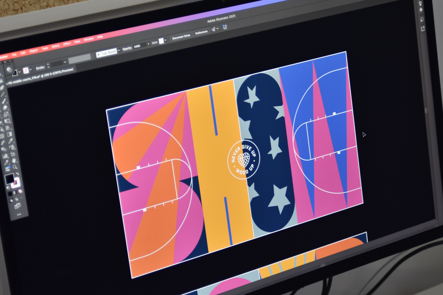 Back in the studio, I developed the two-court design as a unified system, using typography as form. Each court carries a single word, SHOW and LOVE, built from simple shapes that stretch, compress, and interact across the surface. Color is used in blocks, creating rhythm, contrast, and movement at scale.