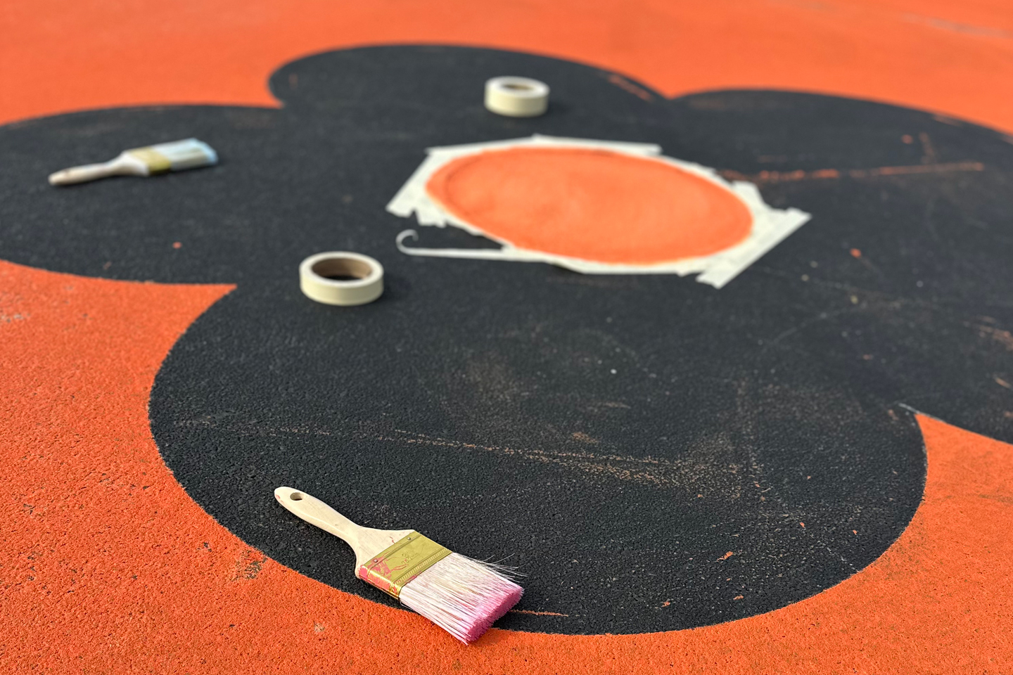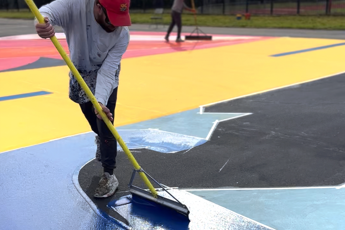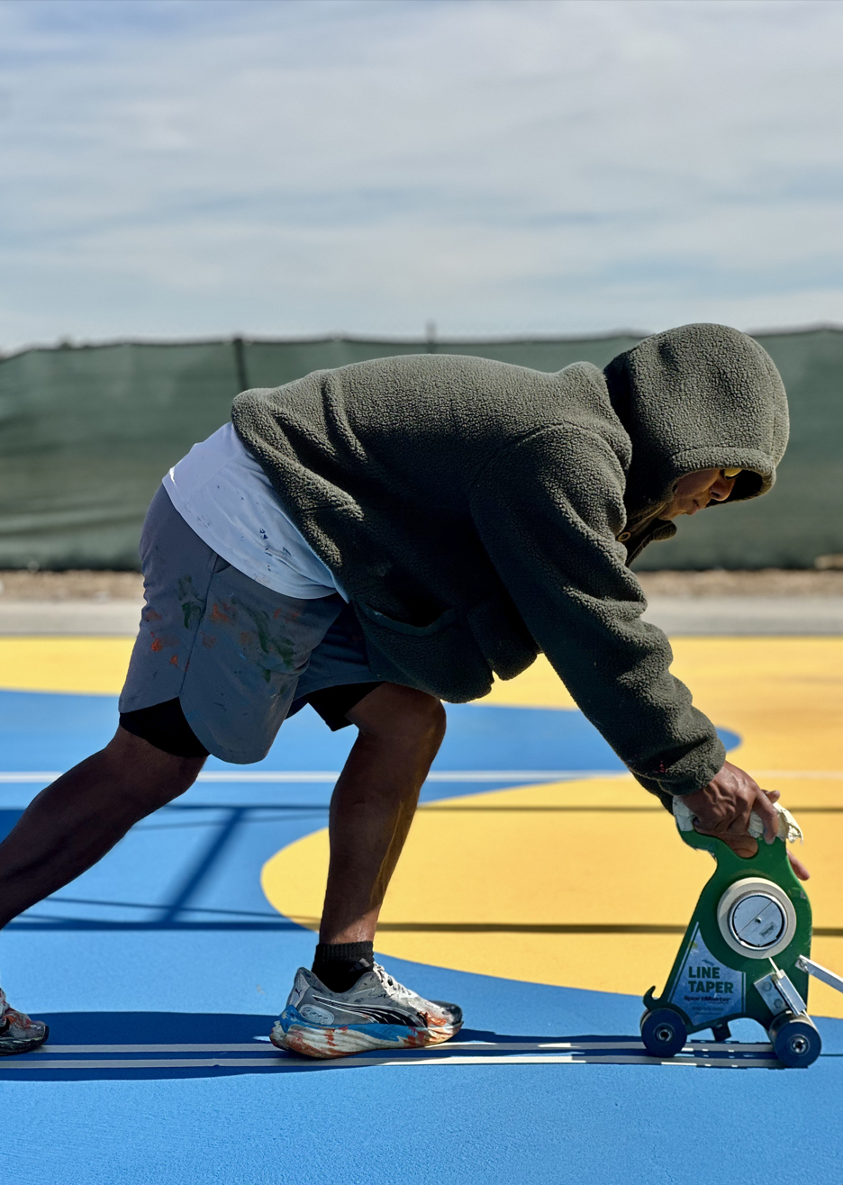 The work moved from drawings to surface. Courts were resurfaced, measured, and taped, preparing the ground for color to be built up layer by layer.