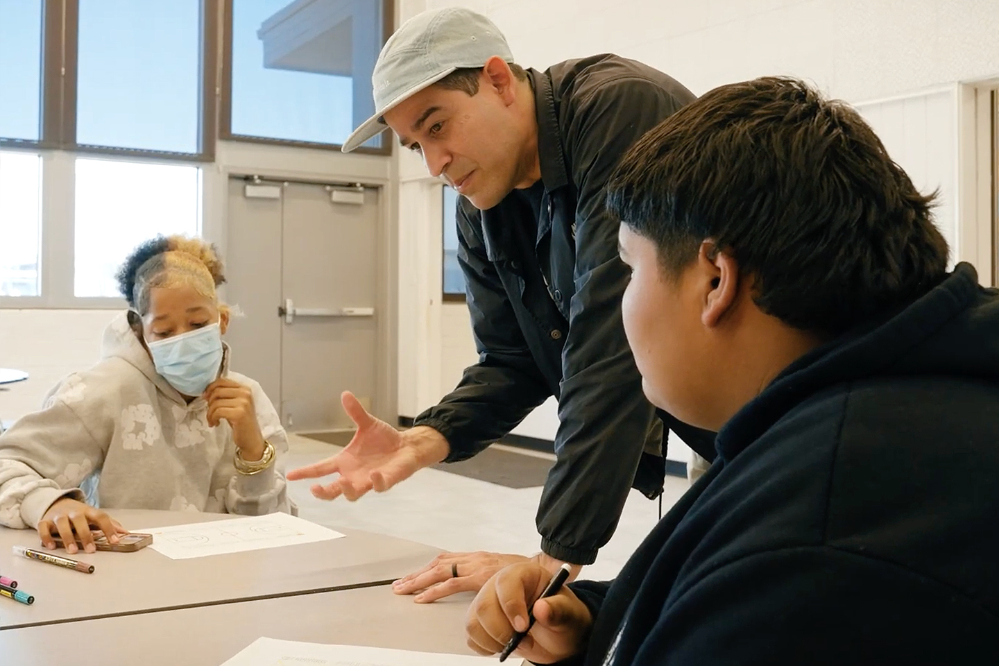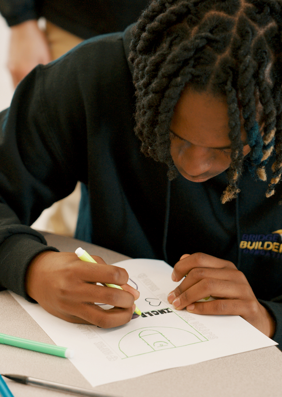 The room shifted from listening to making. We pushed their ideas by introducing contrast, typography, and how individual elements could come together as a larger composition. Students then presented their work back to the group, explaining what they made and why.