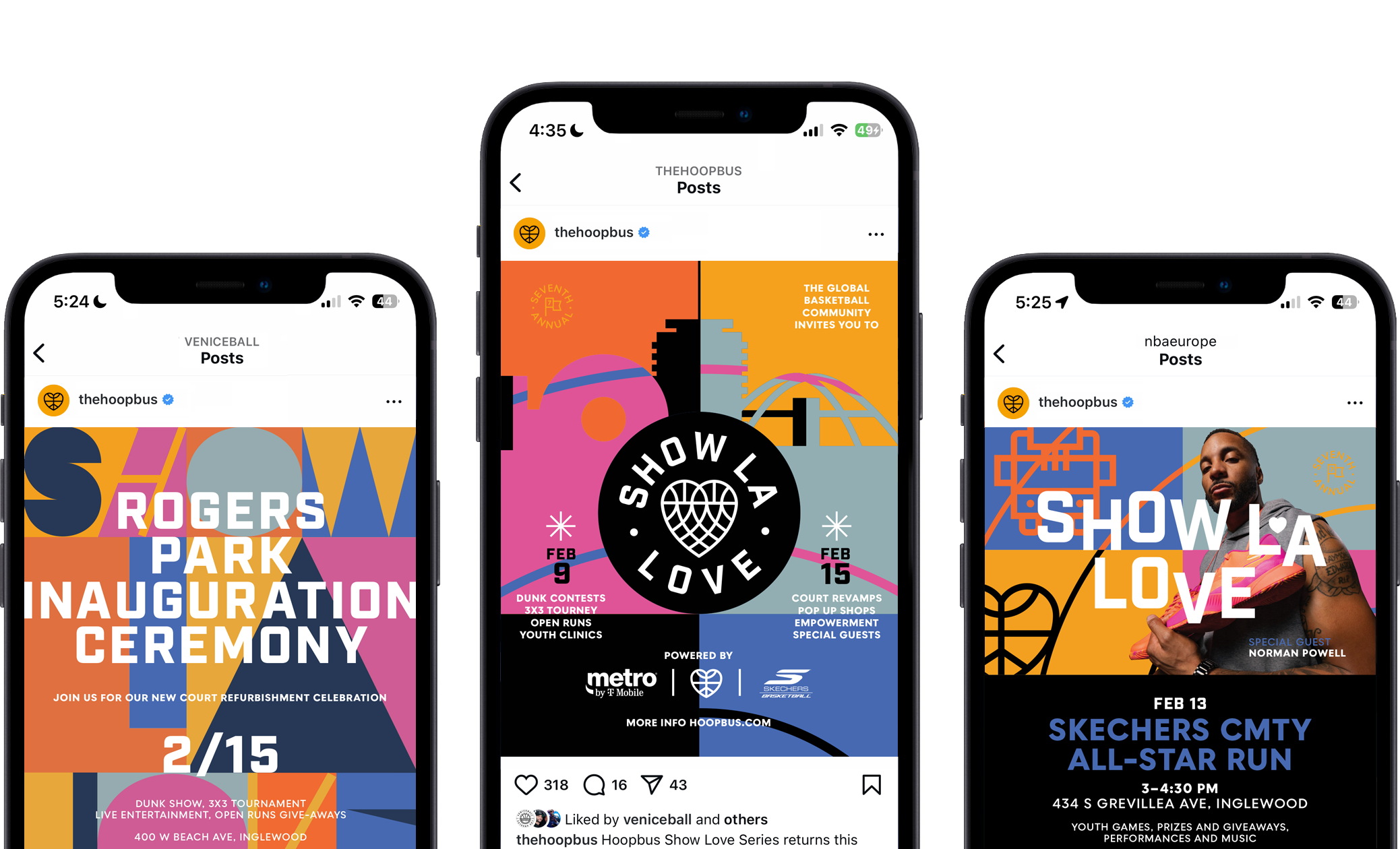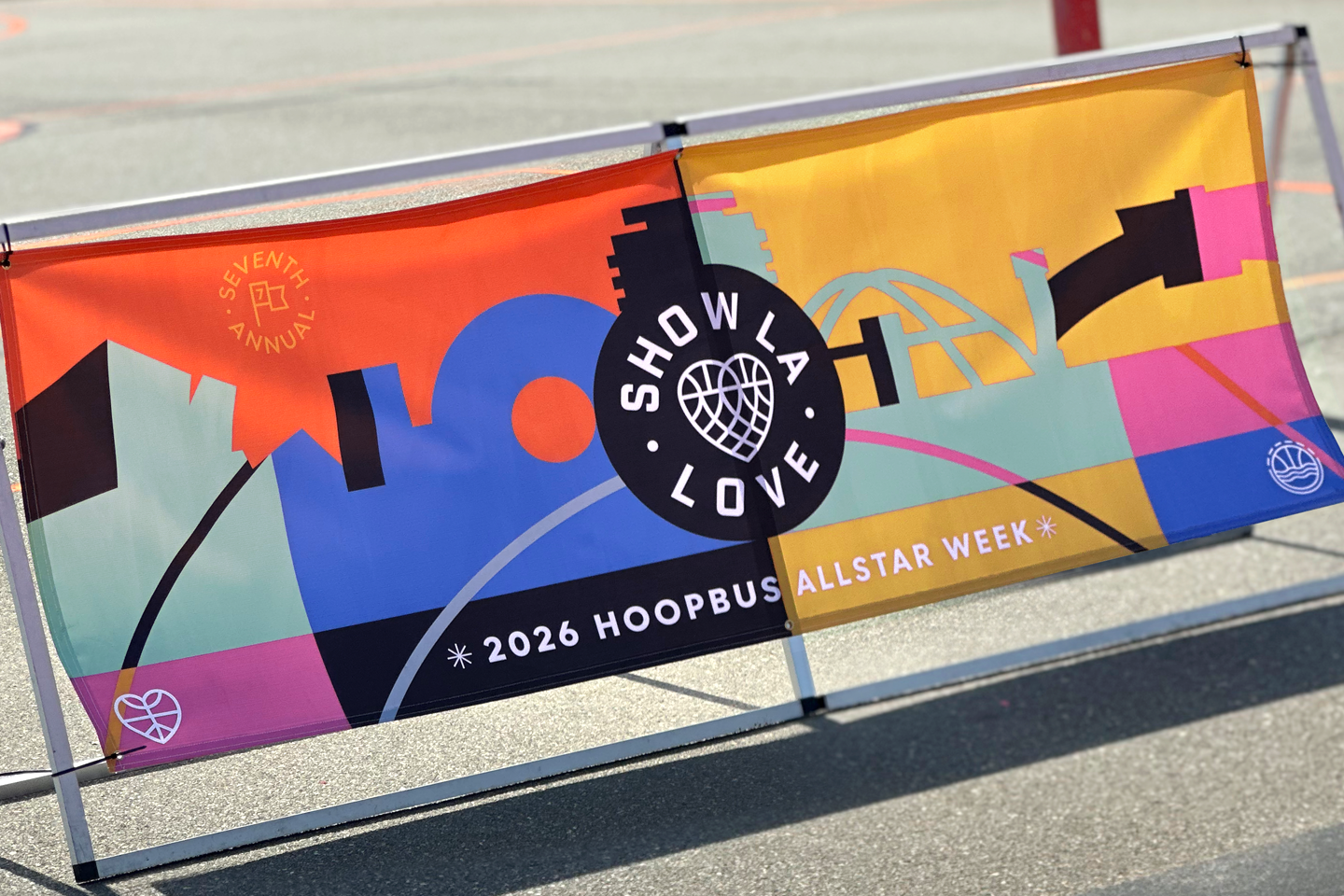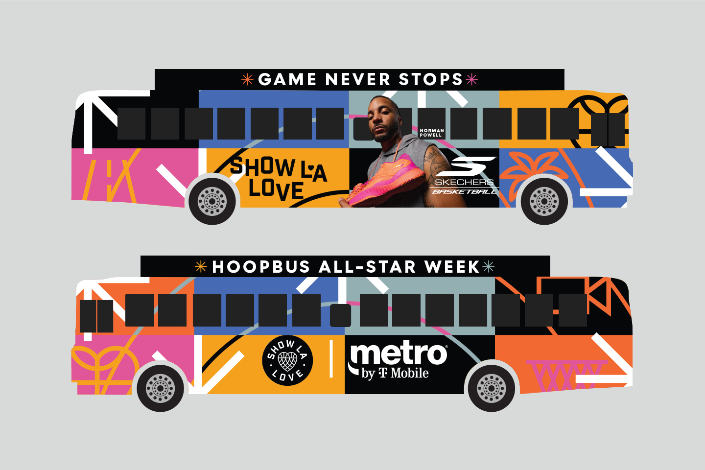 The Show LA Love identity system was developed for Hoopbus during NBA All-Star Week in Los Angeles, moving across the city through a series of activations, partnerships, and community programming.