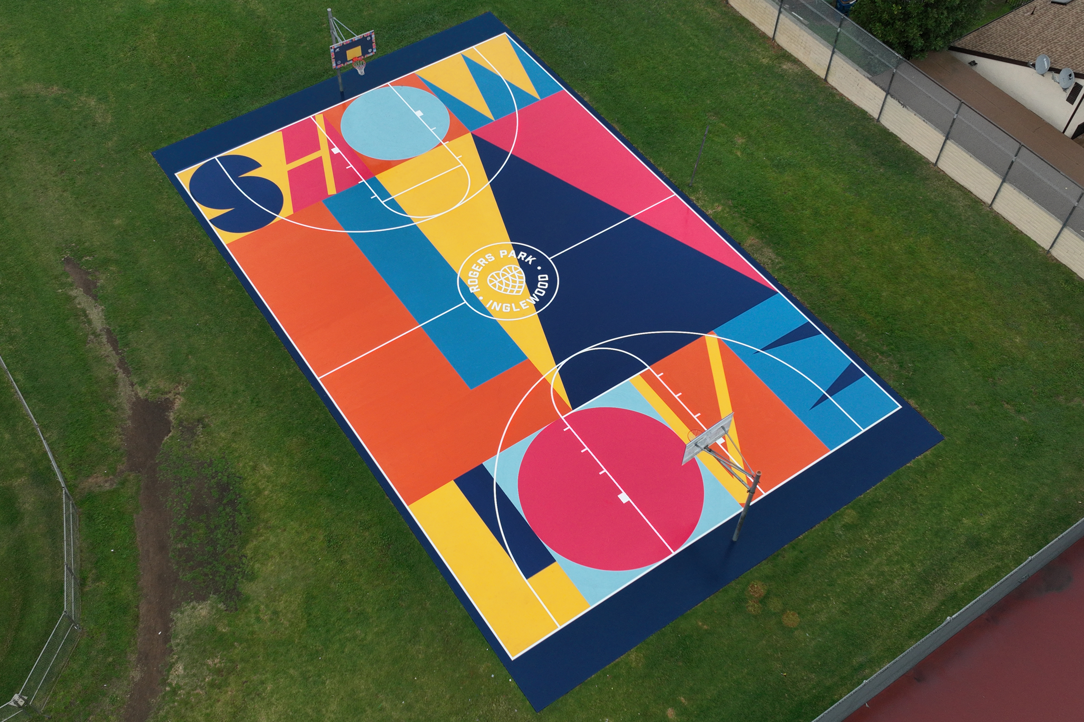 At Rogers Park, a historic basketball site in Inglewood, the court design shifts into a more expressive, site-specific approach. Connected through color and language, the composition comes from my broader body of work—where surface, scale, and movement shape how the game is experienced on the ground.